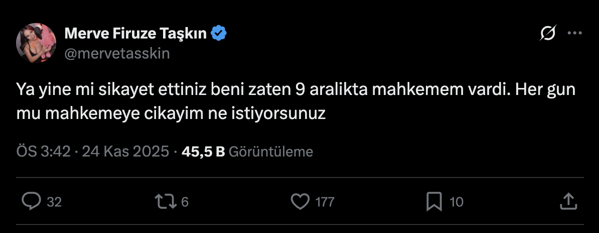 Merve Taşkın, X hesabından yaptığı paylaşımda, “Ya yine mi şikâyet ettiniz beni? Zaten 9 Aralık’ta mahkemem vardı. Her gün mü mahkemeye çıkayım, ne istiyorsunuz?” ifadelerini kullandı. Bu tepki, sosyal medya kullanıcıları ve hayranları arasında yeni tartışmaları beraberinde getirdi.