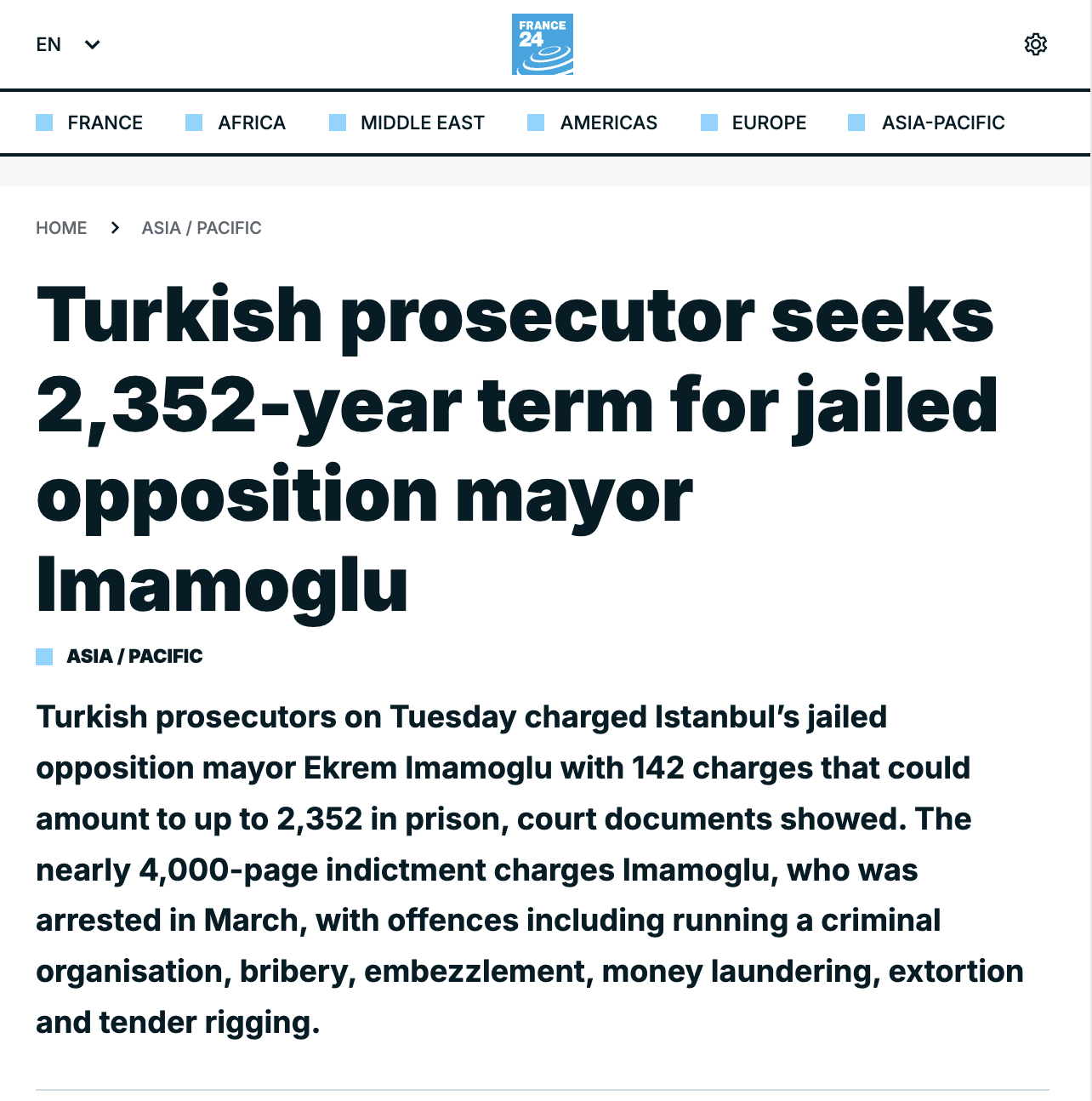 İstanbul Büyükşehir Belediye (İBB) Başkanı Ekrem İmamoğlu hakkında hazırlanan ve 2 bin 352 yıla kadar hapis cezası talep edilen iddianame, uluslararası medyada geniş yankı buldu. Dünya basını, İmamoğlu’nun Cumhurbaşkanı Recep Tayyip Erdoğan’ın “en büyük siyasi rakibi” olduğuna vurgu yaparken, davayı “Türkiye’de siyasî baskının yeni aşaması” olarak değerlendirdi.