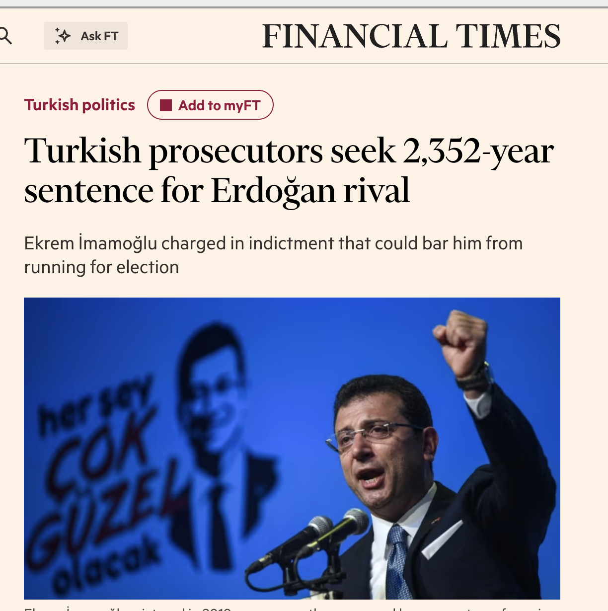 Financial Times, iddianameyi “Erdoğan’ın başlıca rakibinin bir sonraki cumhurbaşkanlığı seçimlerinde aday olmasının engellenebileceği ihtimalini doğuran gelişme” olarak nitelendirdi. Haberde, Türkiye’de bin yılı aşan ceza taleplerinin “son derece nadir” olduğu hatırlatıldı ve iddianamenin ardından borsada düşüş yaşandığı belirtildi.
