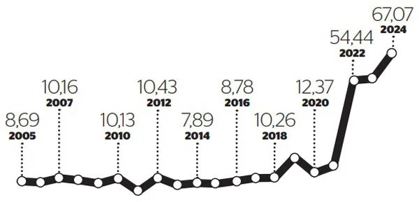 Yüzde 67,07 olan enflasyon yıllık bazda 2005 yılından bu yana gerçekleşen en yüksek şubat enflasyonu oldu. Sadece iki aylık resmi enflasyon yüzde 11,54 olarak gerçekleşti. Merkez Bankası'nın yılsonu enflasyon beklentisi ise yüzde 36 seviyesinde bulunuyor.