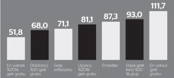 TÜİK'in verilerini değerlendiren DİSK-AR, 'TÜİK, DİSK tarafından açılan ve kazanılan davaya rağmen yargı kararını uygulamıyor ve madde fiyat listesini açıklamıyor. Bu nedenle enflasyon oranını hesaplanmasına kaynak teşkil eden madde fiyat listesi görülemiyor. TÜİK, yargı kararı gereği madde fiyat listesini açıklamalıdır. TÜİK hissedilen enflasyon oranlarını da açıklamalıdır' çağrısını yineledi. TÜİK'in açıkladığı enflasyonun halkın hissettiği gerçek enflasyonu yansıtmaktan oldukça uzak olduğunu vurgulayan DİSK-AR'ın verilerinden yararlanarak yaptığı hesaplamaya göre gıda enflasyonu ortalama yüzde 71,2 olarak gerçekleşirken emeklilerde gıda enflasyonu yüzde 87,3 oldu. Üçüncü yüzde 20'lik gelir grubunun gıda enflasyonu yüzde 81,1 olurken, düşük gelirli ikinci yüzde 20'lik grubun gıda enflasyonu yüzde 93 ve en yoksul yüzde 20'lik gelir grubun gıda enflasyonu ise yüzde 111,7 olarak gerçekleşti.