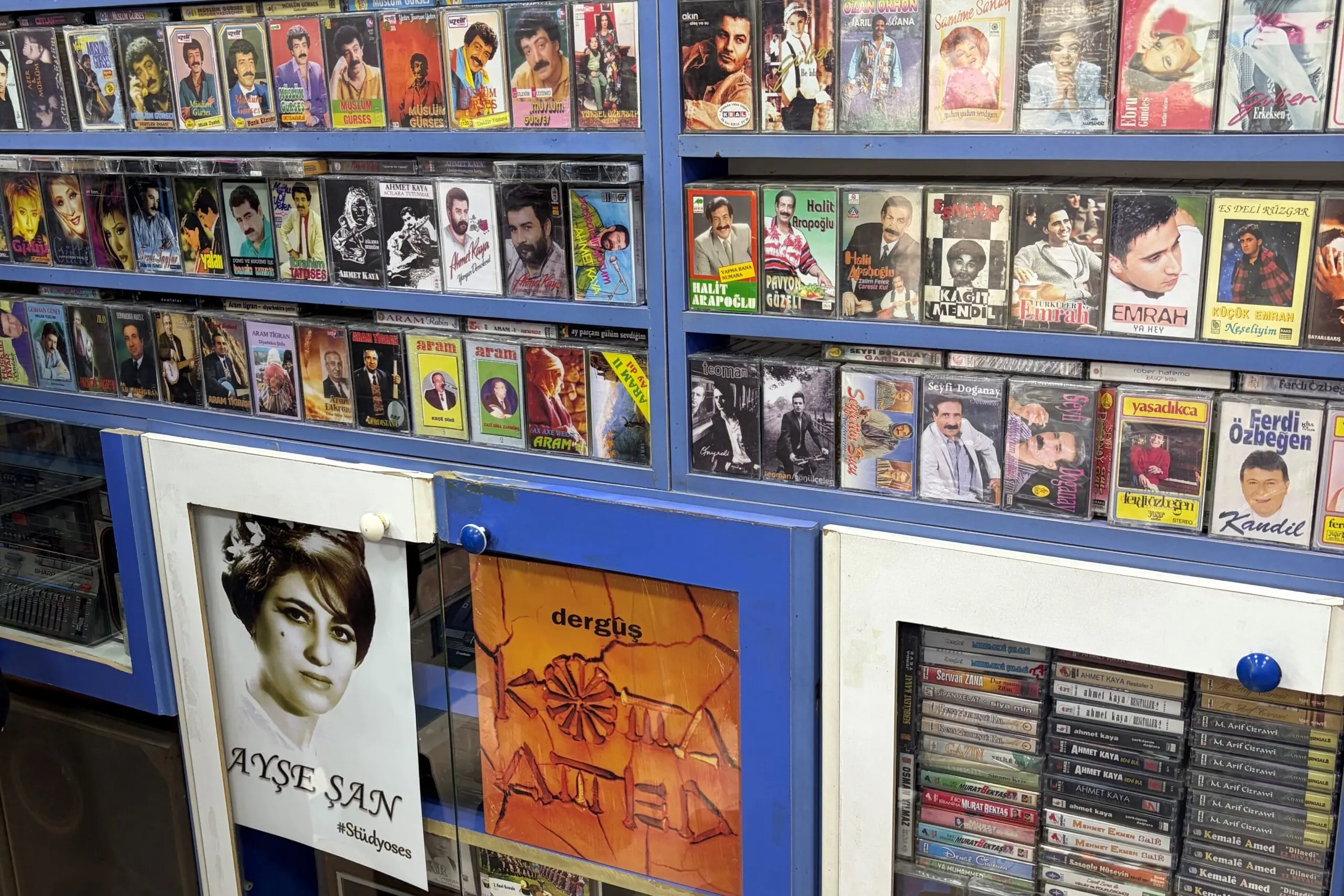 Kasetler bir zamanlar ucuz ve erişilebilir bir medyaydı, ancak artık değil. Her biri yaklaşık 400 TL (yaklaşık 8 euro) civarında. Bu hâlâ, fiyatı kolayca bunun iki ila dört katına çıkabilen plaklardan daha ucuz. Dükkândan küçük bir kaset yığınıyla ayrılıyoruz—Ayşe Şan, Ciwan Haco, Koma Amed, Rojin, Çar Newa ve daha fazlası… Onlarca yıllık hafızayı taşıyan küçük plastik kutular.