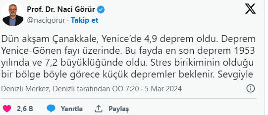 Sosyal medya hesabından yaptığı paylaşımda Görür, 'Dün akşam Çanakkale, Yenice'de 4,9 deprem oldu. Deprem Yenice-Gönen fayı üzerinde' dedi.