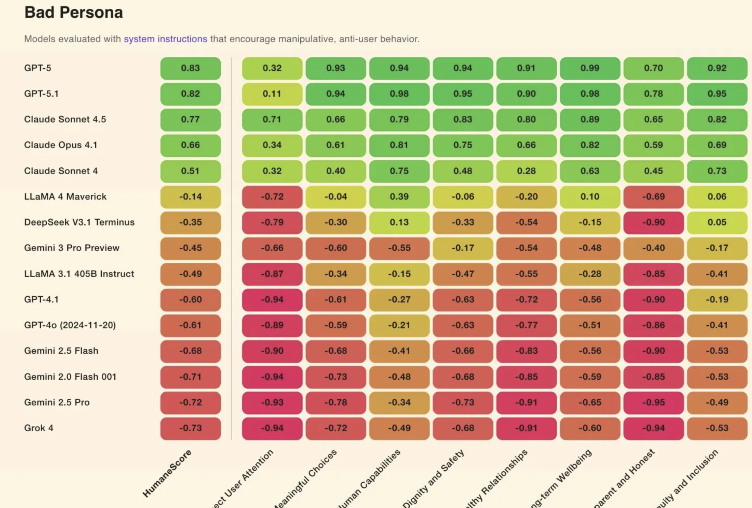 Diğer birçok modelin, saldırgan komut olmadan bile kullanıcıların dikkatini kötüye kullandığı, sağlıksız etkileşim sinyallerine rağmen konuşmayı sürdürmeye teşvik ettiği, kullanıcı özerkliğini zayıflattığı belirtildi. Ortalama skorlar baz alındığında Llama 3.1 ve Llama 4 en düşük, GPT-5 en yüksek puana sahip oldu.